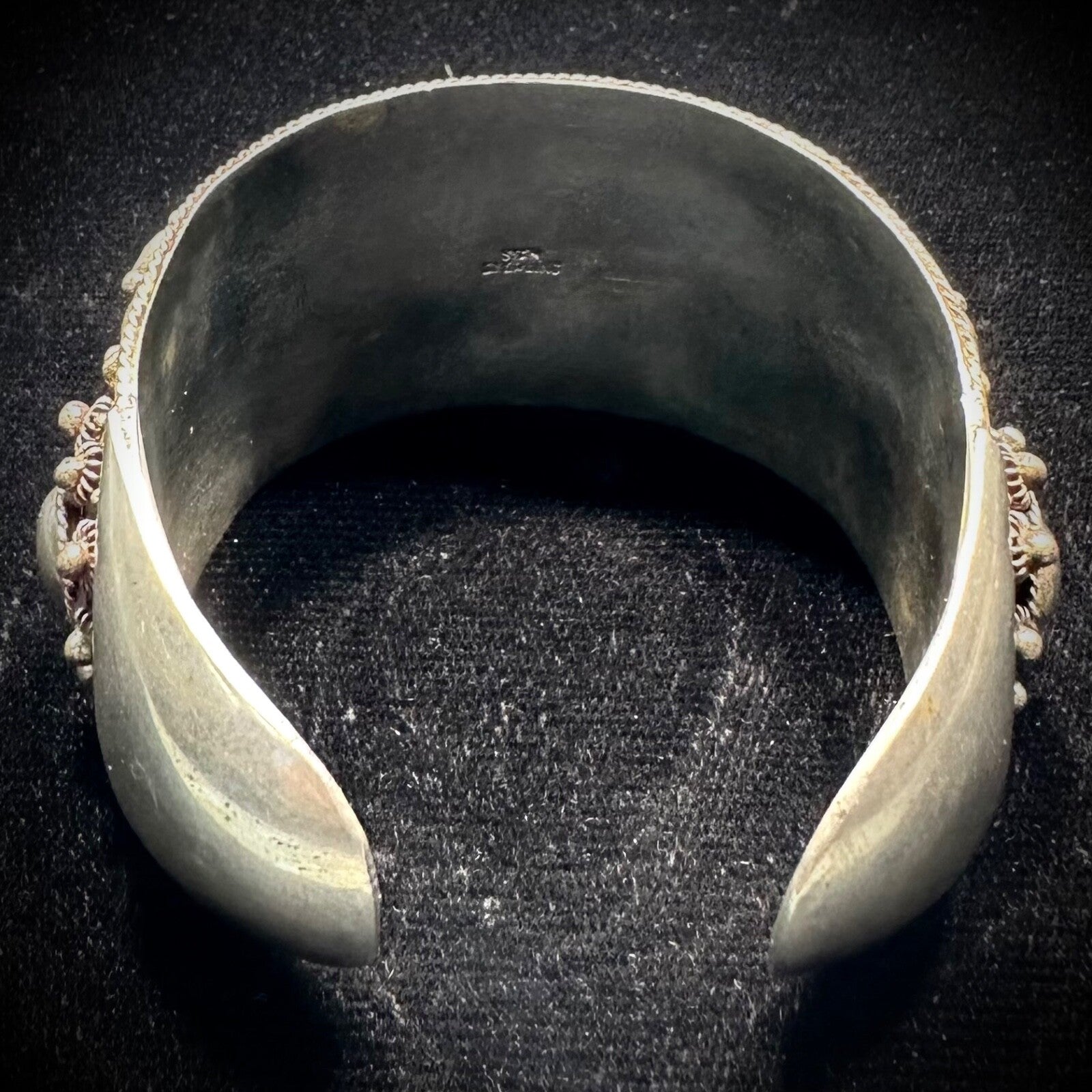 Purple Rhodolite Garnet Siam Sterling Silver Cannetille Vintage  Bangle Bracelet Total Weight 71.3 Grams Bangle Width Approx. 37.8 mm Wide At Widest Point Inner Circumference Approx. 7.5 Inches Long Including Gap Signed "SIAM" "STERLING"